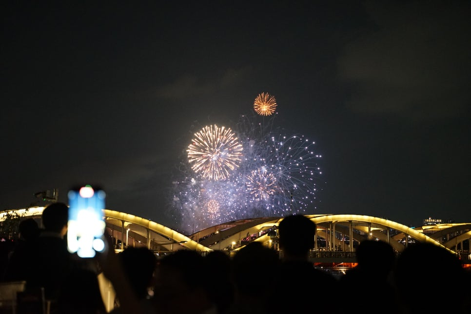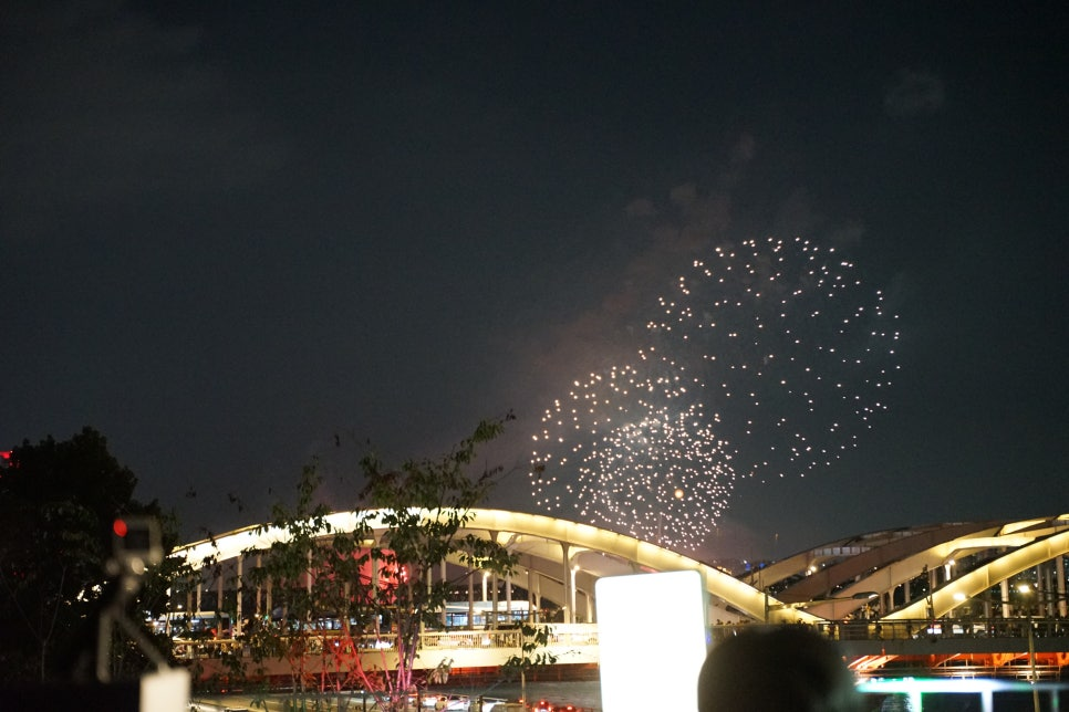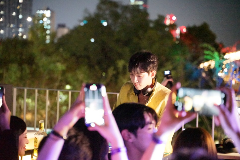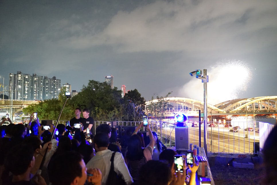 날이 저물기 시작하고 디제잉 파티의 열기도 점점 올라가고 있습니다. 이날 정말 많은 관객들이 와주셔서 디제잉 파티를 즐겨주셨습니다. 불꽃 축제가 본격적으로 시작되는 시간에는 다들 휴대폰과 카메라를 꺼내 불꽃놀이의 아름다운 풍경을 즐기기 위해 정말 많은 사람들이 스테이지에 몰렸습니다.