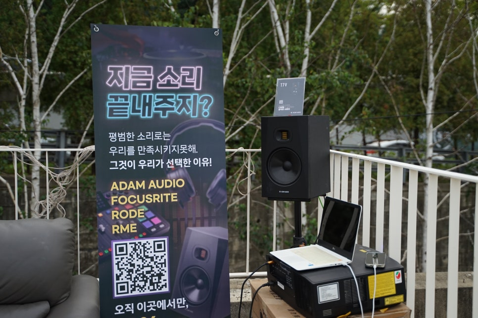 사각을 해소해 주는 위성 스피커가 설치된 곳에는 자운드 15% 할인 홍보 배너 및 ADAM 스피커 팝업을 설치하였습니다. QR코드를 통해 ADAM 스피커 외 여러 브랜드의 음향장비를 할인된 가격으로 구매하실 수 있는 페이지로 이동하실 수 있도록 세팅해 두었습니다.
