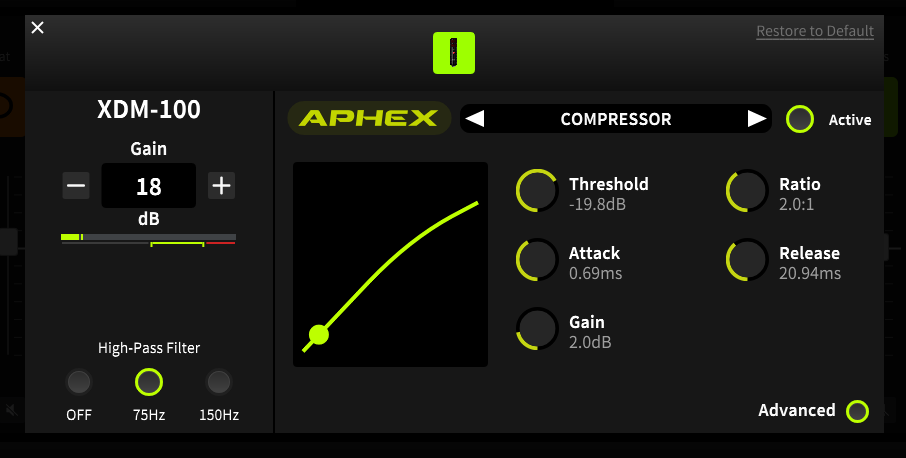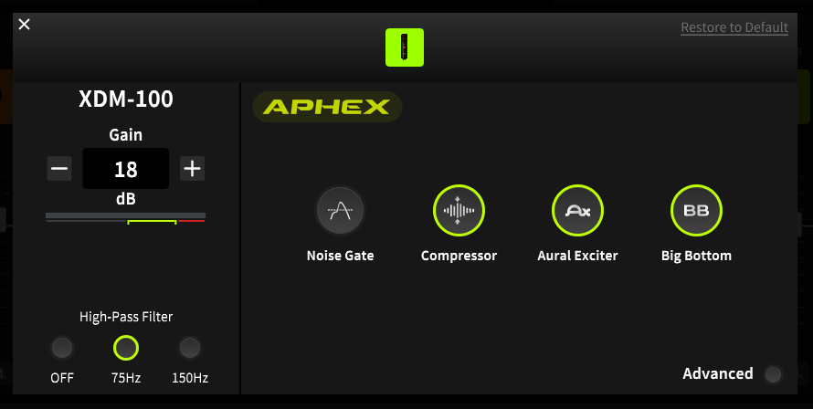 APHEX® 오디오 프로세싱 기술을 통해 다음과 같은 효과를 실시간으로 적용할 수 있습니다.