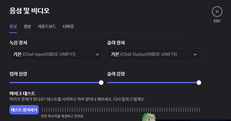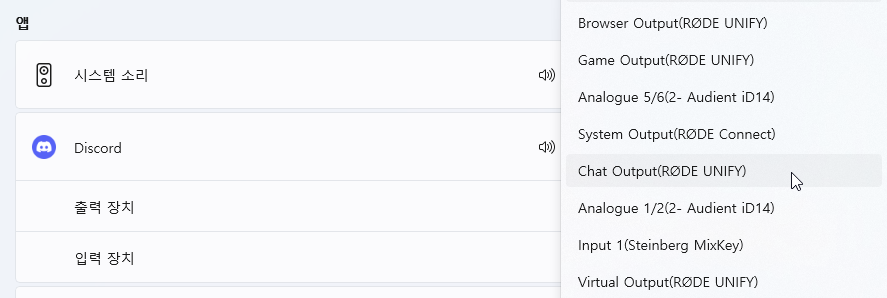 디스코드와 같이 별도의 오디오 설정이 가능한 프로그램에서는 각 분류에 맞는 입, 출력 채널을 선택하여 지정하여 가상 채널을 할당할 수 있습니다.