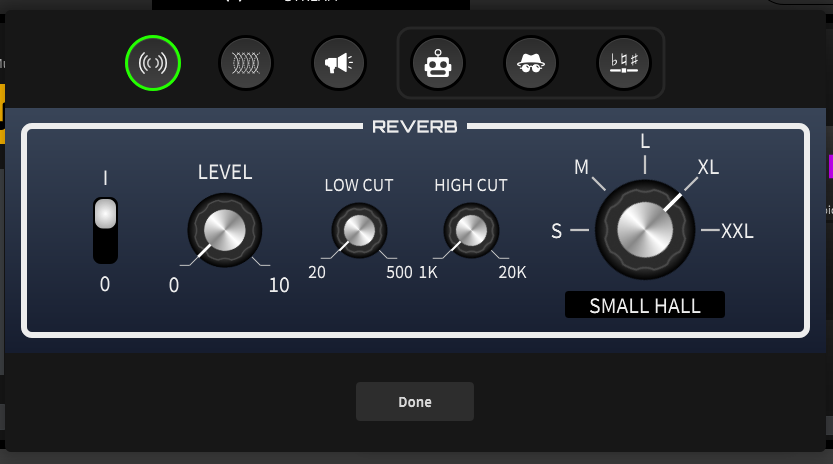 각 음성효과 FX들은 On/Off 버튼과 상세한 설정이 제공됩니다. 가장 많이 사용하게 되는 Reverb(리버브)를 예를 들면 우측부터 On/Off 버튼, 적용량을 지정하는 Level 노브, 울림의 저음과 고음을 조절하여 깔끔한 울림을 만들어 낼 수 있는 LowCut과 High Cut, 울림의 사이즈를 정해주는 Room 노브까지 VST 플러그인에 버금가는 상세한 설정을 진행할 수 있습니다.