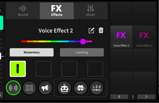 아래의 동그란 아이콘은 이펙터의 종류로 좌측부터, Reverb, Echo, Megaphone(확성기 소리), Robot(로봇 소리), VoiceDisguise(음성 일그러뜨리기), Pitch Shifter(음성변조)등 다양한 음성효과 FX를 적용할 수 있습니다.
