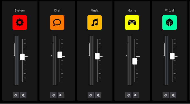 Unify는 엄밀히 말씀드리면 루프백을 지원하지 않지만 가상 입력 채널 지원을 통해 루프백과 동일한 기능을 훨씬 더 직관적으로 수행할 수 있습니다. Unify는 마이크 입력 채널 외에도 System, Chat, Music, Game, Virtual 총 5가지의 가상 채널을 지원합니다.