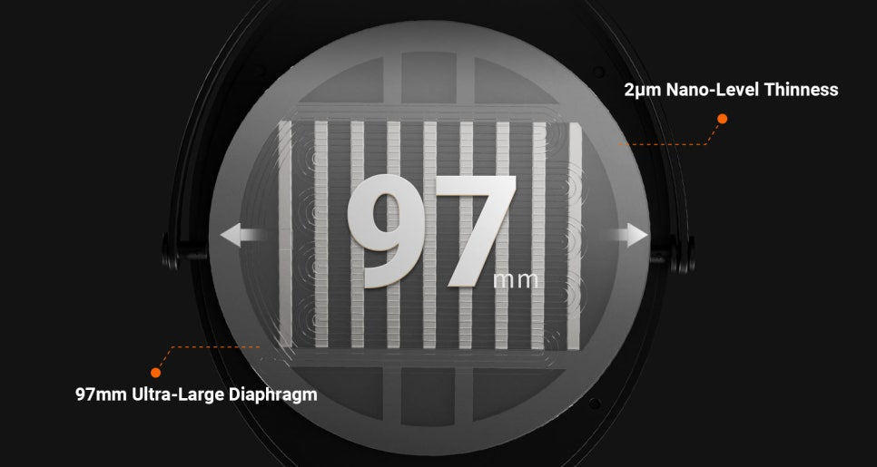 핵심은 97mm 초박막 평판형 다이어프램입니다. 정밀 스피터 코팅(1.3~2나노미터)과 대칭 N50 네오디뮴 마그넷 매트릭스(한쪽당 22개)가 결합해 고해상도와 저왜곡의 응답성을 구현합니다. 후면에는 고강도의 어쿠스틱 매쉬를 배치해 개방형 특유의 개방감과 안정적인 댐핑을 동시에 확보했습니다.