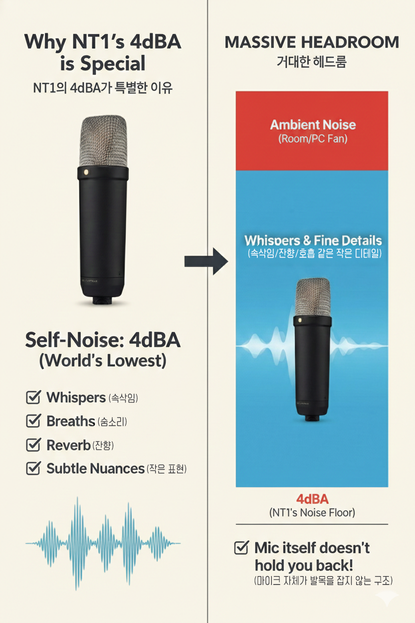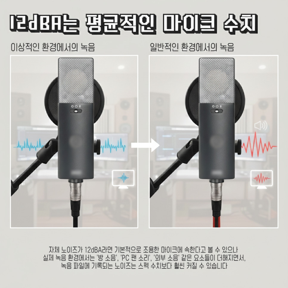 따라서 마이크의 성능은 단순한 숫자만 보고 판단해서는 안 됩니다. 녹음 환경과 함께 고려해야 비로소 제대로 평가할 수 있습니다. 이 점을 이해해야, 왜 초저노이즈 설계가 중요한지도 자연스럽게 연결됩니다.