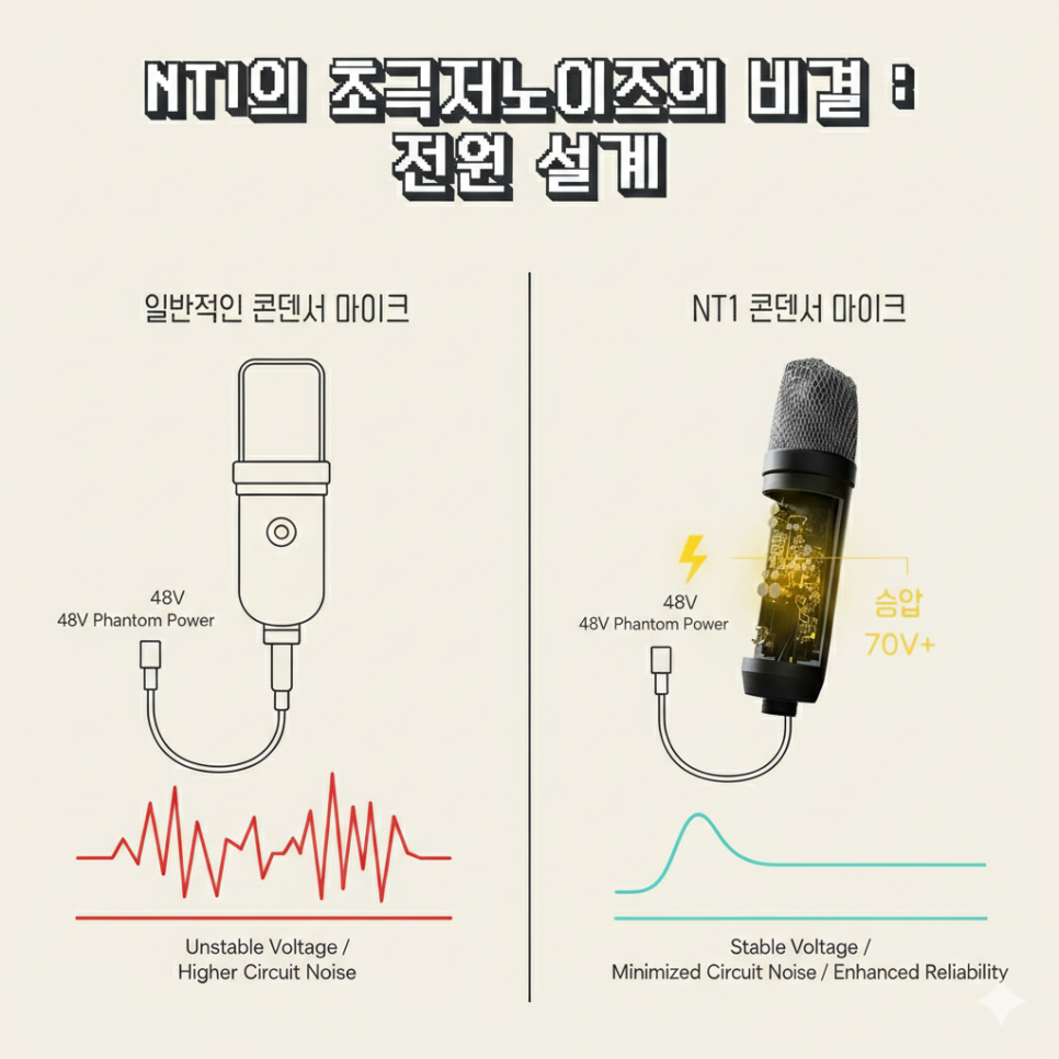 전압이 높아지고 안정되면 신호 처리 과정에서 불필요한 잡음이 줄어들고, 마이크 본연의 소리에 더욱 집중할 수 있게 됩니다. 결과적으로 NT1 시그니처는 구조적으로 노이즈가 적을 수밖에 없는 설계를 갖춘 마이크라고 볼 수 있습니다.
