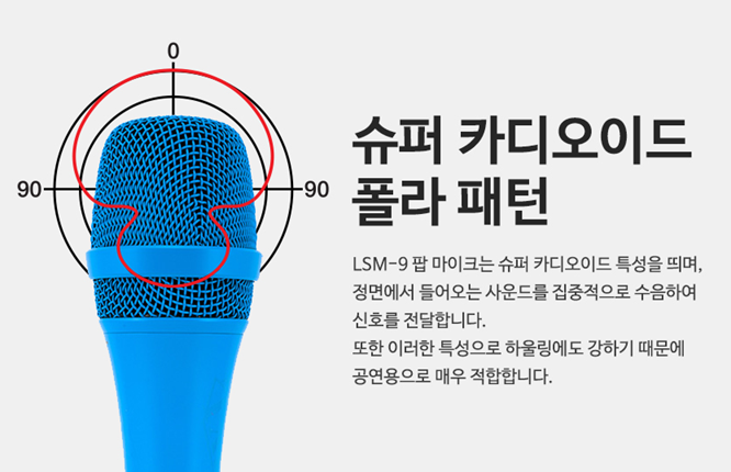보통 마이크가 단일 지향성(Cardioid)이지만 LSM-9은 초지향성(Super Cardioid) 특성을 띄며 초지향성 마이크의 특징인
