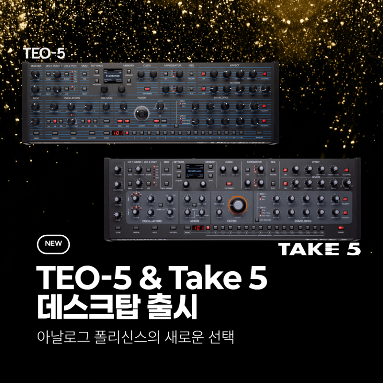 이번 TEO-5 Desktop Module과 Take 5 Desktop Module의 국내 정식 출시는, 고급 아날로그 폴리신스를 더 많은 유저가 현실적인 환경에서 접할 수 있게 해주는 반가운 소식입니다. 큰 키보드 일체형 신스가 부담스러웠던 유저, 이미 마스터 키보드 기반의 작업 환경을 갖춘 유저, 혹은 공간 제약 없이 진짜 아날로그 폴리신스의 매력을 경험하고 싶었던 유저라면 이번 데스크탑 모듈은 매우 설득력 있는 선택지가 될 것입니다.