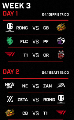4월 10일 금요일 오후 5시에는 vs 치즈버거와의 경기가, 토요일 약 4시에는 vs ZETA DIVISION과의 경기가 예정되어 있습니다.