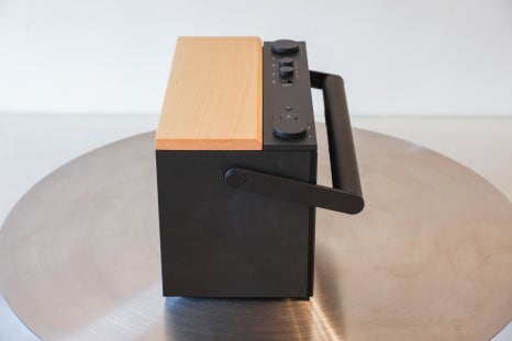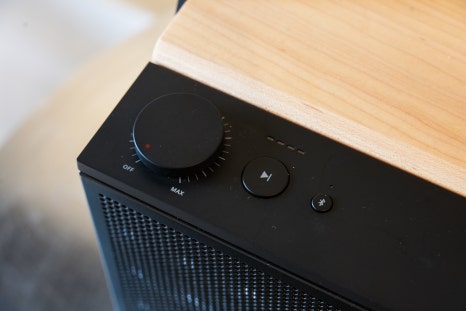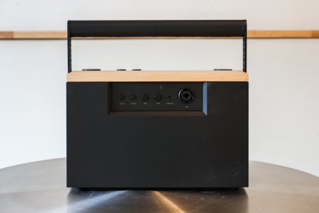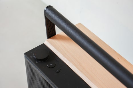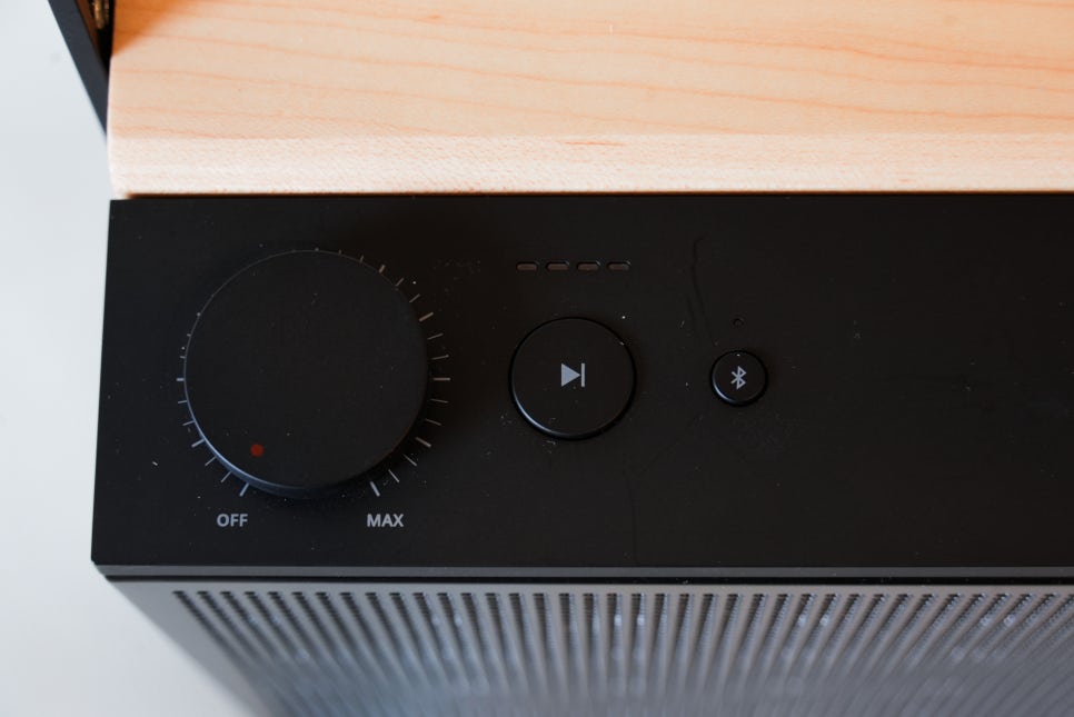 이 각도에서는 스피커 전면뿐 아니라 상단의 볼륨 조절부와 컨트롤 영역까지 함께 확인할 수 있어 전체적인 디자인 구성을