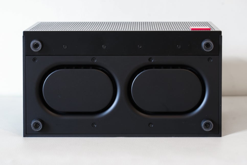 하단에는 스피커를 안정적으로 설치할 수 있도록 받침 구조가 적용되어 있어 책상이나 바닥에 두고 사용할 때 안정적으로 거치할 수 있습니다.