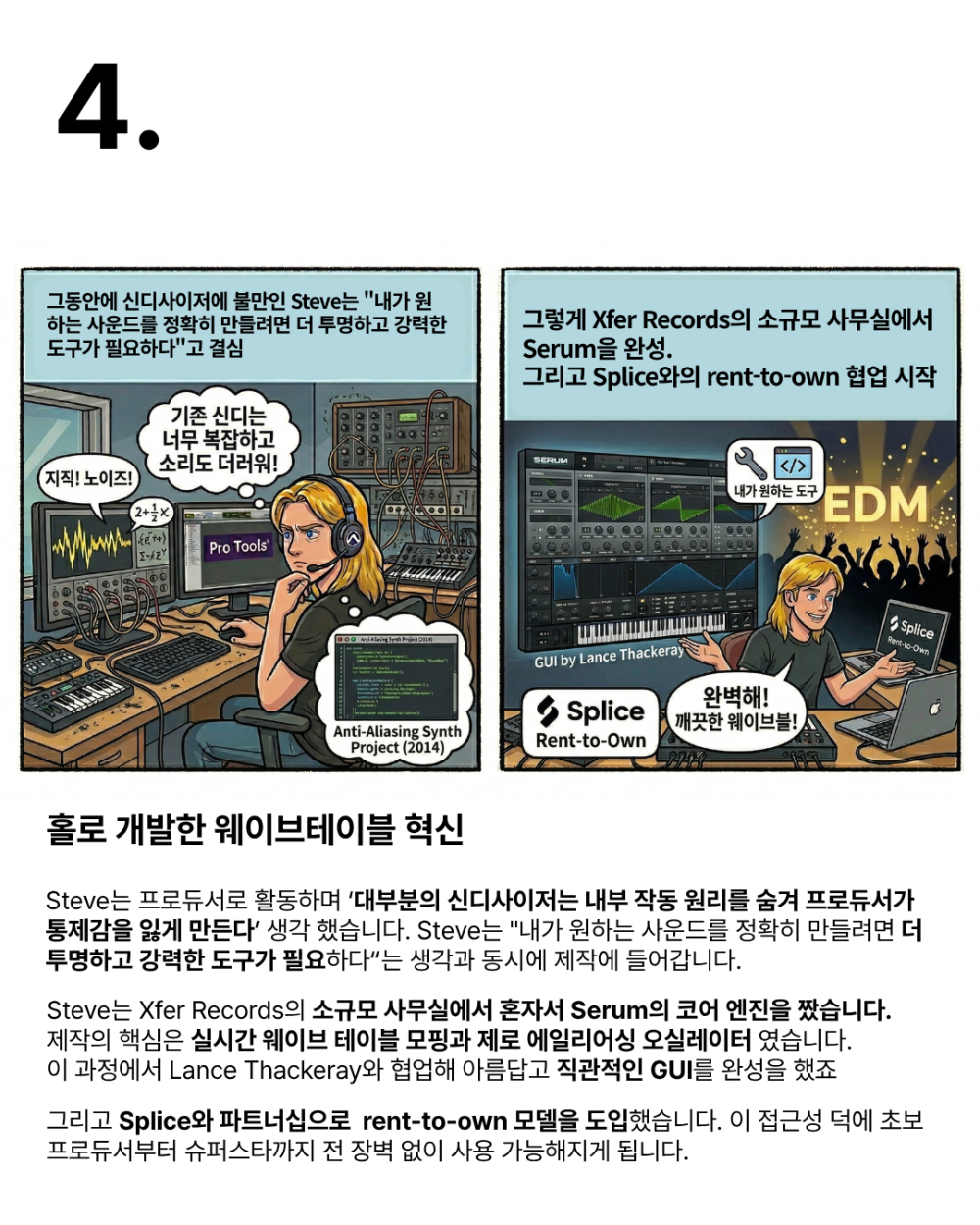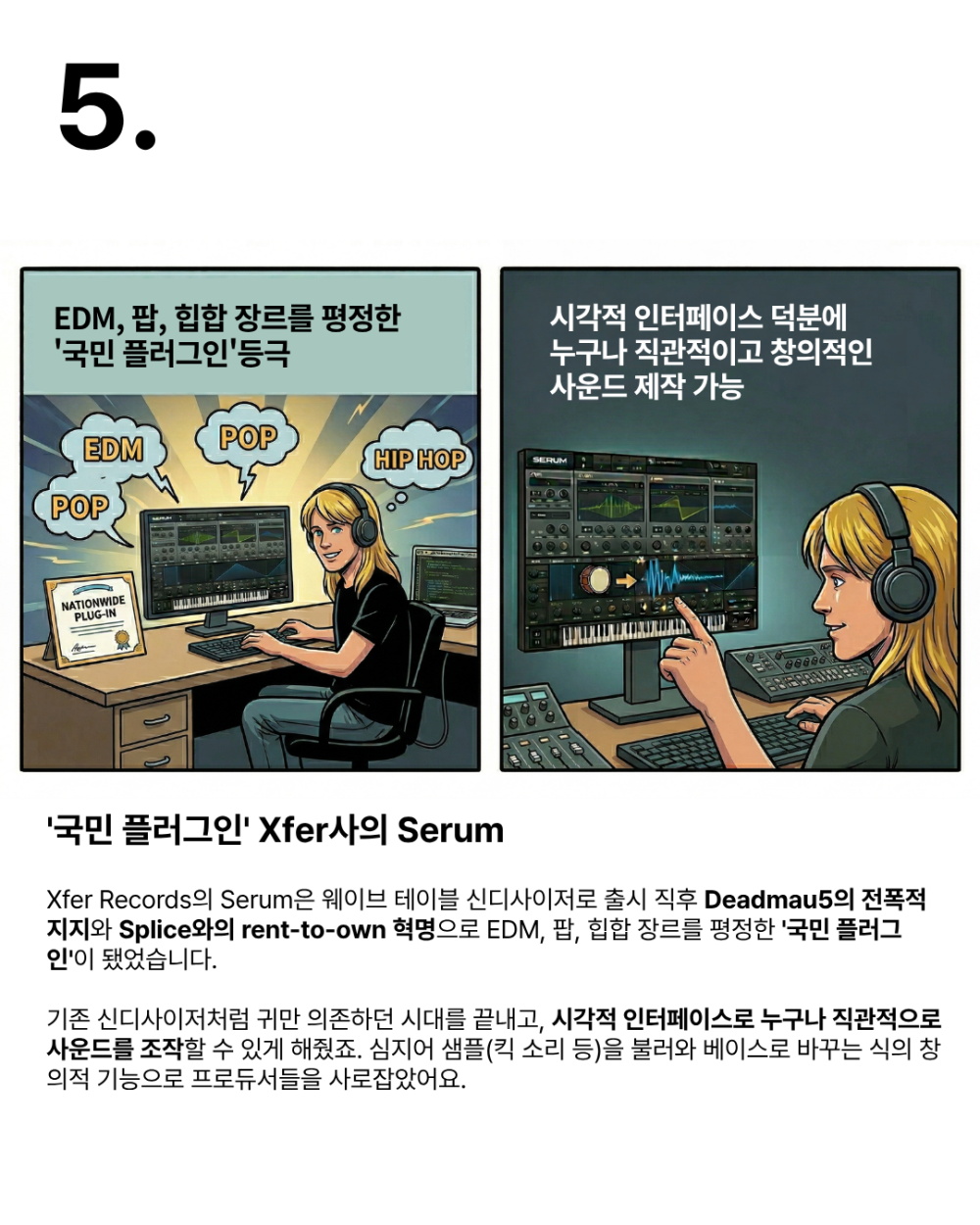 안녕하세요 사운드캣 홍대점 드림스페이스 깜냥이입니다. 오늘은 국민 플러그인 [Serum]의 탄생 이야기를 가져왔습니다. 2014년 9월 19일 [Serum] 1이 정식 출시되었고 2025년 3월 18일 [Serum] 2가 기습 출시되었습니다. 기존 웨이브 테이블 신스 방식에서 벗어나 멀티 샘플, 그레뉼라 합성 엔진이 추가되었으며 오실레이터가 3개로 증가했습니다. 국내와 해외 수많은 아티스트가 사용하는 플러그인으로 저도 구매해서 잘 사용했던 기억이 있네요. 세럼의 장점이라 하면 역시 내가 만든 소리가 시각화 되어 직관적으로 볼 수 있다는 것입니다. 소리 하나만 피드백 요소로 사용하는 것보다 청각과 시각 두 가지로 피드백을 할 수 있다는 건 정말 큰 장점입니다.