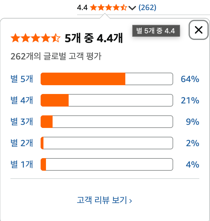 아마존닷컴에서 262개 이상 리뷰에 평균 레이트 5점 만점에 4.5