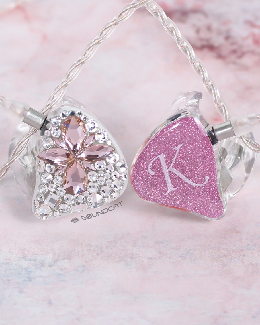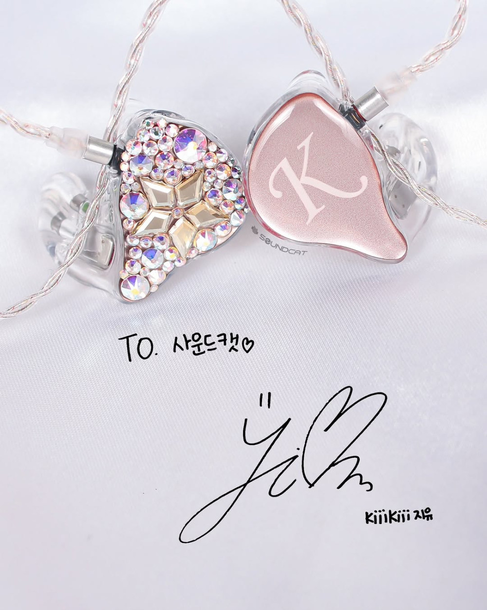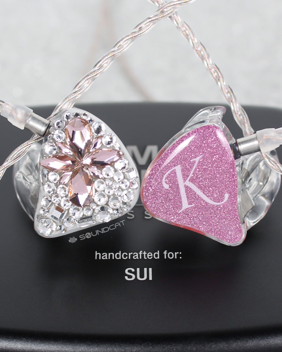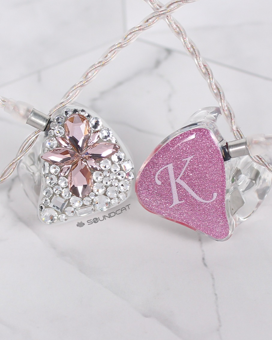 지유 (JIYU)님 커스텀: 투명한 쉘에 핑크빛 페이스 플레이트, 그리고 한쪽 유닛 전체를 덮은 영롱한 스톤 장식이 압권입니다.