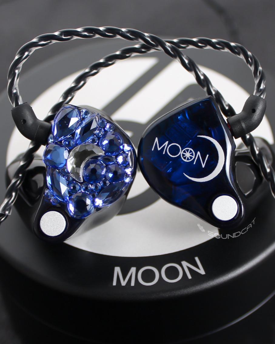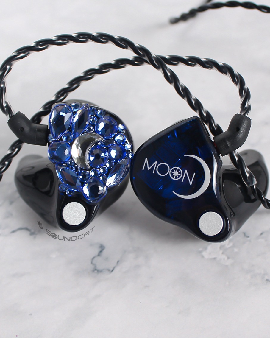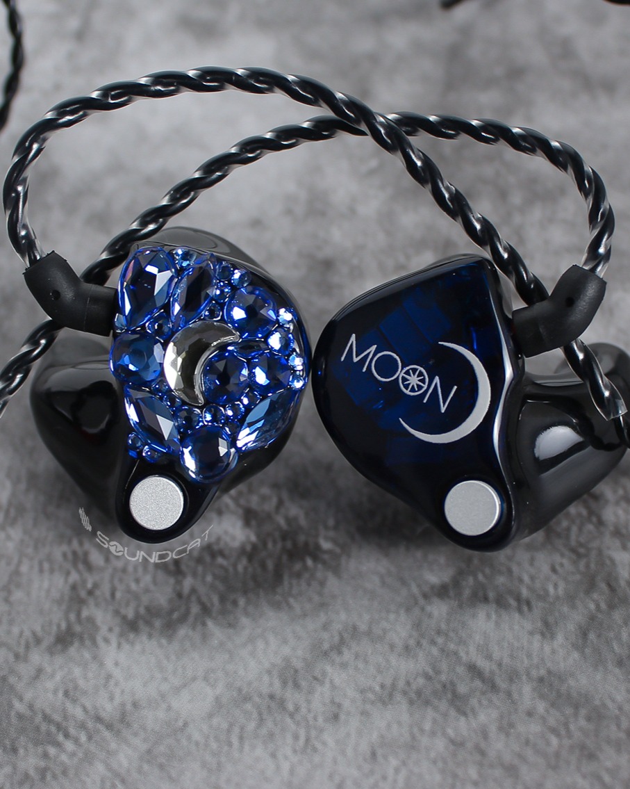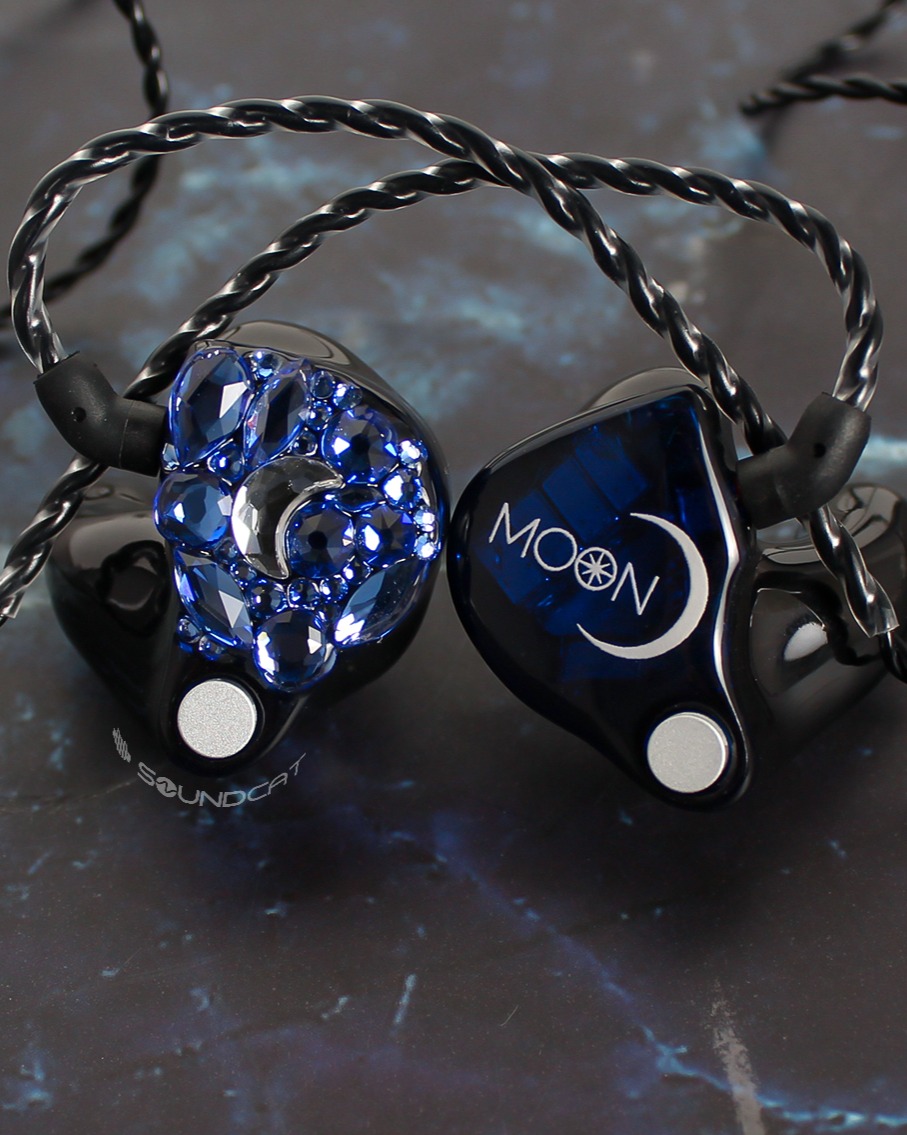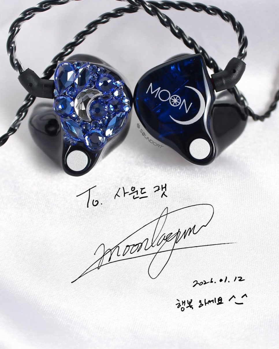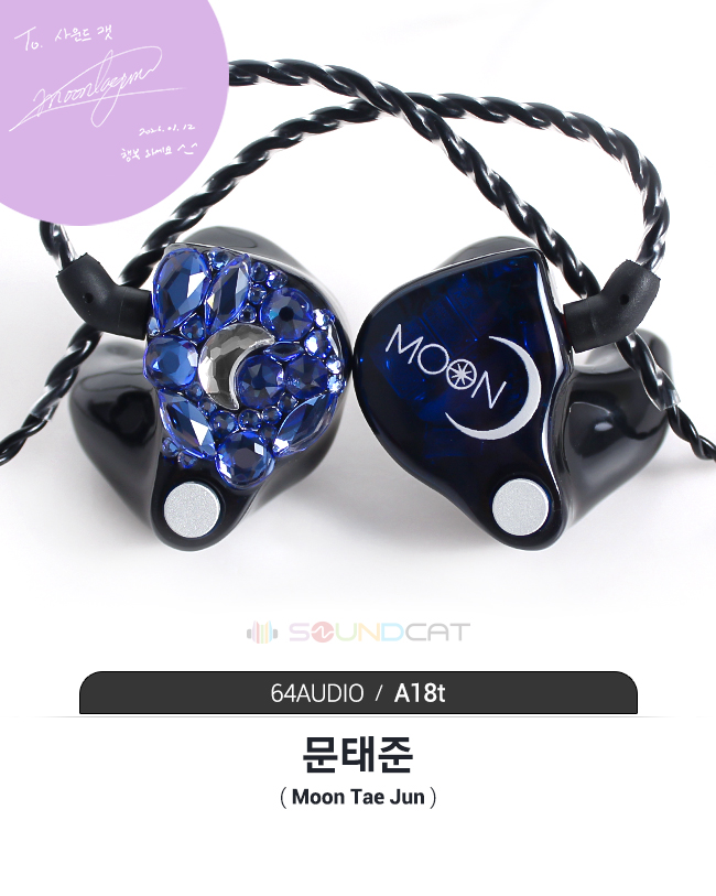 문태준 (Moon Tae Jun) 님 커스텀: 한쪽은 화려한 블루 스톤 아트로 달 형상을 구현했고, 다른 한쪽은 'MOON' 로고와 초승달 심볼을 새겼습니다. 아티스트의 성함(MOON)을 상징적인 예술로 풀어낸 독보적인 커스텀입니다.
